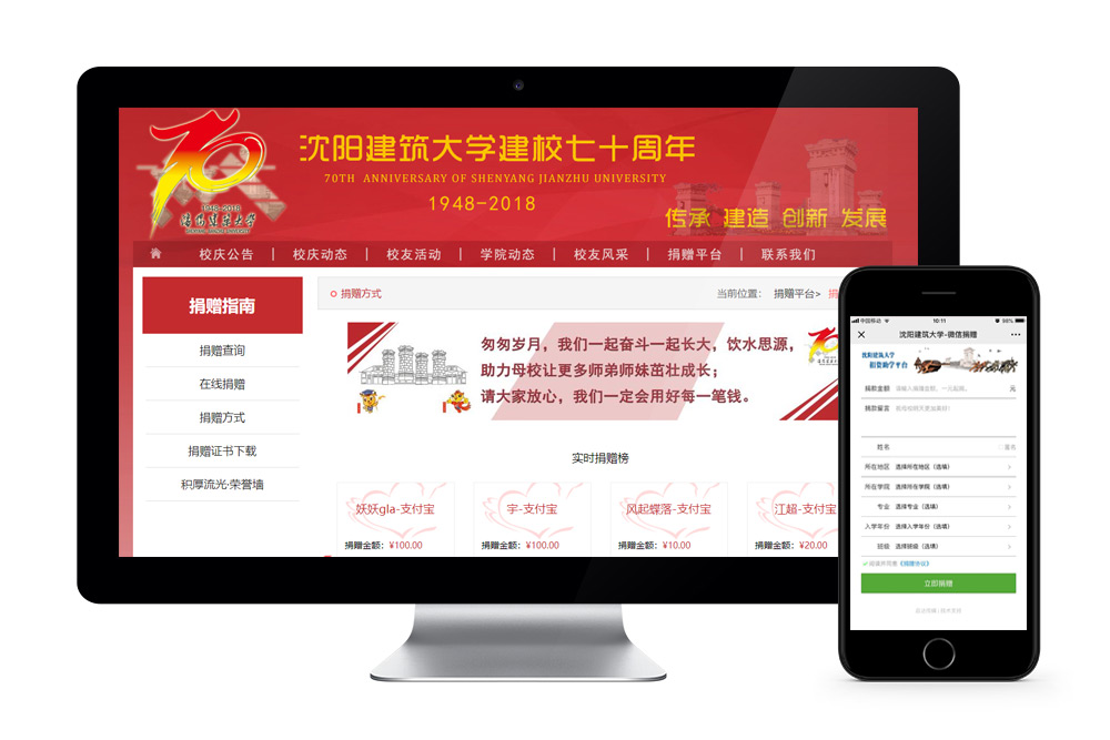 我公司為沈陽建筑大學建校70周年,設計開發線上捐贈系統,包含電腦端捐贈系統+公眾號捐贈系統,實現智能線上捐款,捐款展示,捐款統計、查詢、捐贈證書下載等功能。