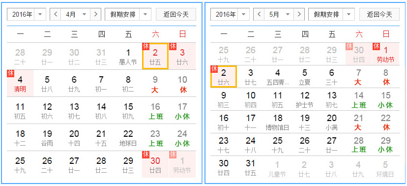 2、勞動節:5月1日放假,5月2日(星期一)補休,共計3天。如下圖